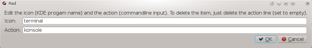 Each item has an icon (either an icon name from KDE or the path to an icon) and an action. The action is simply the command you would call in the shell (only simple commands, though, no real shell scripting or glob).